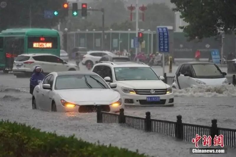 7月20日,河南鄭州,車輛經(jīng)過積水路段。近日,鄭州連遭暴雨襲擊,持續(xù)強(qiáng)降雨導(dǎo)致部分街道積水嚴(yán)重。