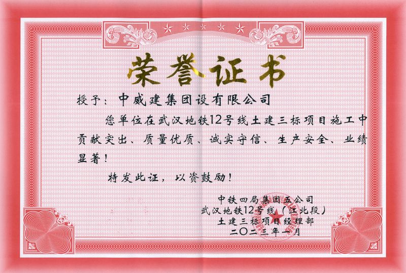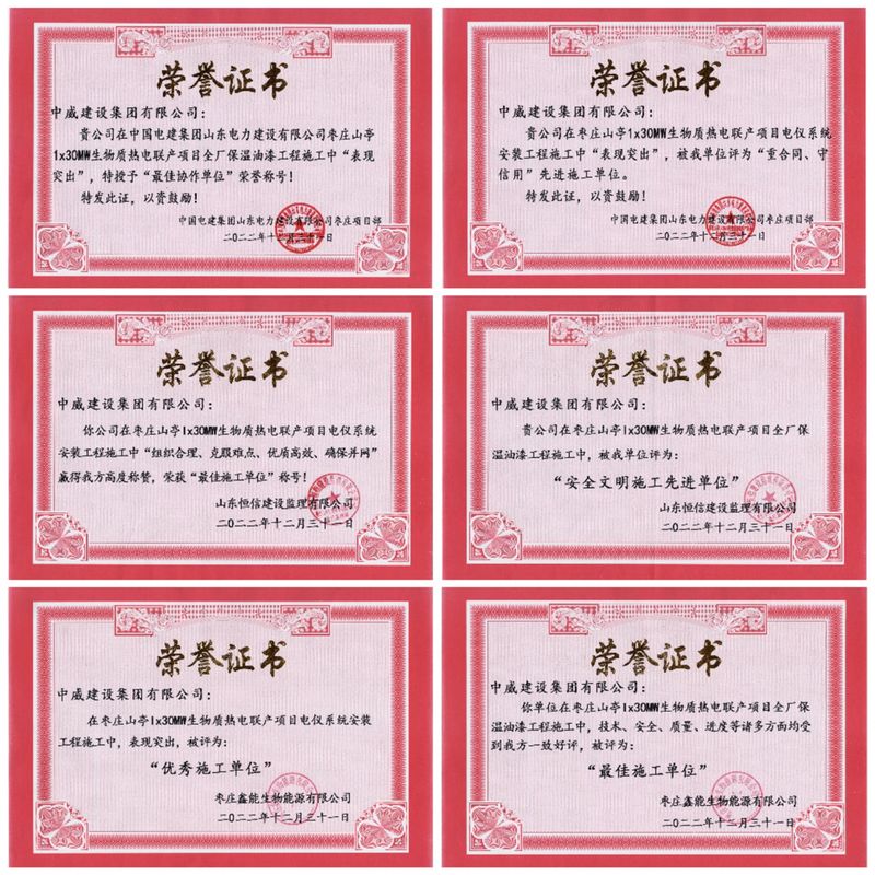 年末歲尾,喜報頻至。在公司領導的正確指引下,中威集團所承建的多個項目得到了業主、監理、總包的充分認可,各項榮譽紛至沓來。集團所承接的武漢地鐵12號線土建三標項目在施工中貢獻突出、質量優質、誠實守信、生產安全、業績顯著,獲得項目部通報表揚;佘兵凱經理在武漢地鐵12號線土建三標項目施工中表現突出,被評為優秀項目經理。集團所承接的山東棗莊山亭1×30MW生物質熱電聯產項目全廠保溫油漆工程和電儀系統安裝工程在項目經理高隨省的帶領下也是成績斐然,中威集團被業主棗莊鑫能生物能源有限公司、監理方山東恒信建設監理有限公司、總包方中國電建集團山東電力建設有限公司棗莊項目部授予“優秀施工單位”、“最佳施工單位”、“安全文明施工先進單位”、“最佳協作單位”、“重合同守信用先進施工單位”等榮譽稱號。
